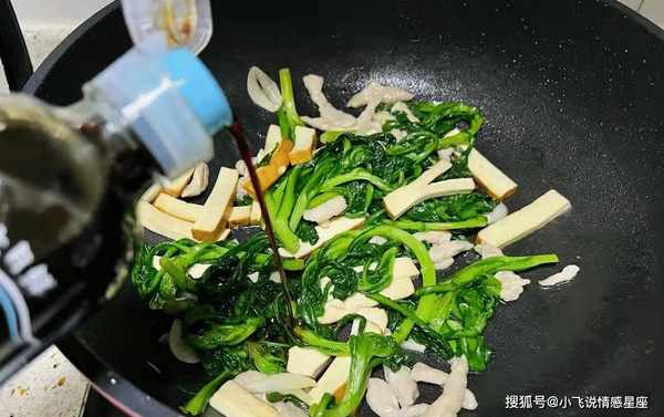 第六步:加点原味酱油,味道很鲜,将香喷喷的干条快速炸至顺滑,捞出备用。