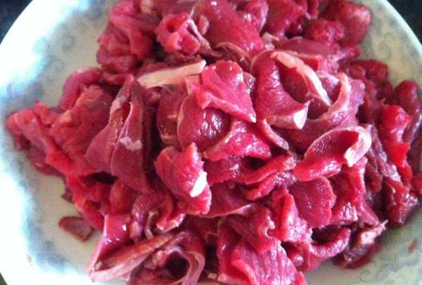 第一步:准备好以上食材,将鲜嫩的牛肉洗净,将牛肉逆纹切片,将牛肉片的血水和血水用清水洗净。