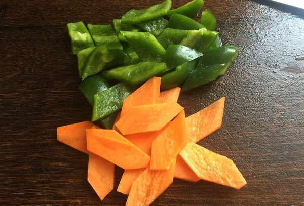 第三步:青椒多洗净切块,洋葱洗净切块备用,胡萝卜洗净切菱形块,胡萝卜用热水烫一下,这样胡萝卜入味更好。