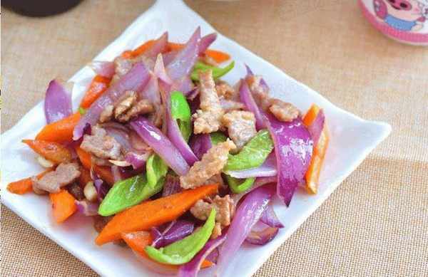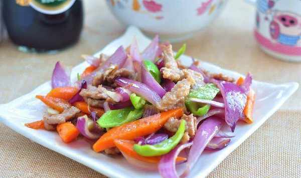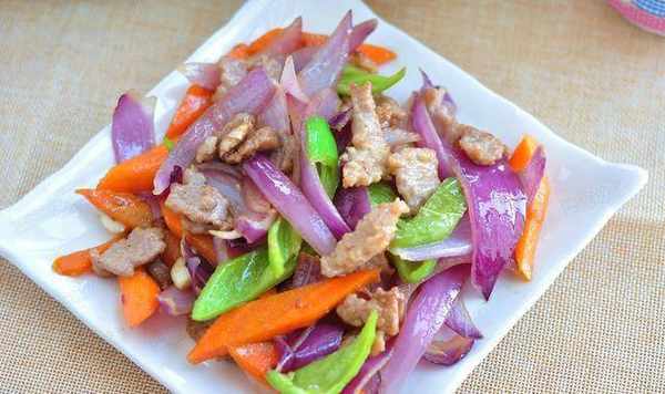 选料技巧:选择紫洋葱一个(一定要买带洋葱皮的新鲜洋葱),准备50克青椒,选择中等大小的胡萝卜一根,猫里脊半根,蛋清一个,淀粉少许,色拉油少许、料酒少许、花椒少许、蒜姜少许、花椒少许、盐少许等调料。