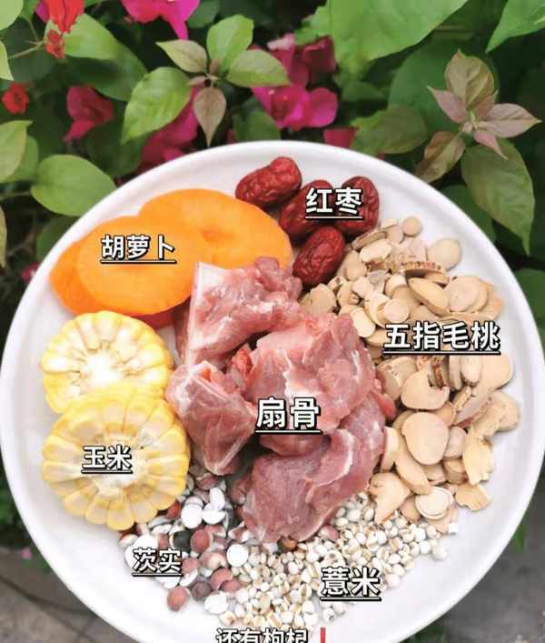 配料:五指桃适量(五指桃是中药煲汤的传统药材之一,广东人喜欢用它来炖汤,健脾开胃,有助消化的作用),芡实少许,薏米20克左右,胡萝卜一根,红枣适量,枸杞少许,选择骨干300克(选择肉少的骨干,骨汤的营养在骨头里,骨干就是首选清蒸骨干肉汤)、玉米、水少许、姜片、料酒几匙、其他调料。