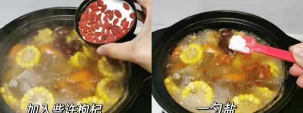 第五步:盖上锅盖,大火烧开。转小火煮一个多小时。最后,撒上一些枸杞子,撒上盐和胡椒粉再煮5分钟。