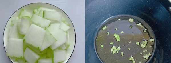 第五步:冬瓜片沥干水分,冬瓜炒20秒,锅中加入开水三杯,盖上锅盖,将汤烧开。