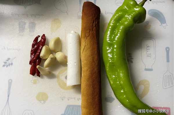 材料选择:选择青椒(也可以选择红椒或洋葱),选择豆腐卷(豆腐卷又叫素鸡,一定要新鲜无异味),选择大葱半个,4瓣大蒜、干灯笼椒少许、鲜味少许、蚝油一小勺、白糖少许、色拉油少许、盐少许、鸡精等。