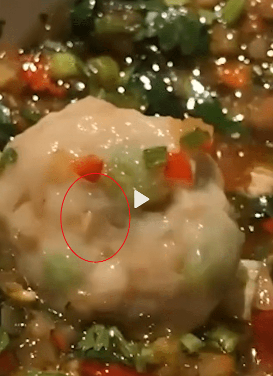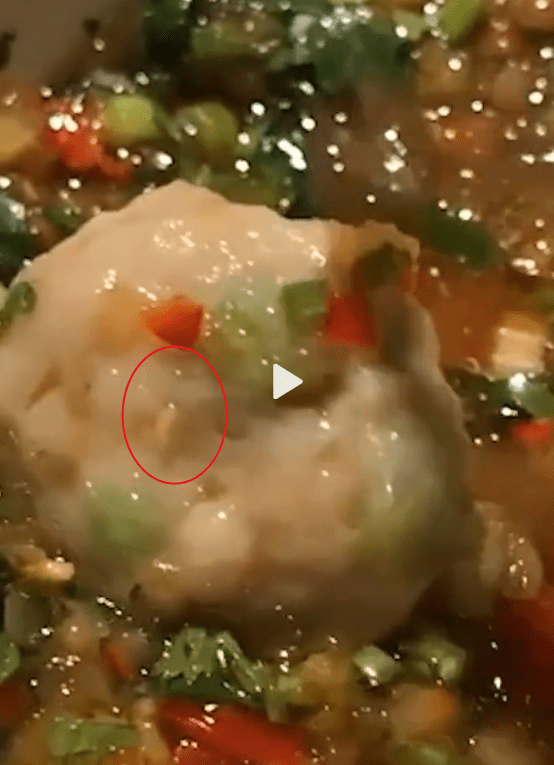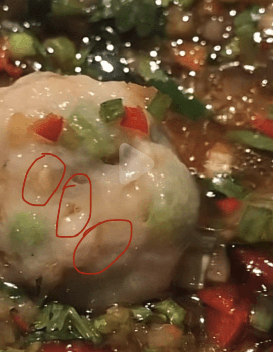 视频显示,顾客正拿着肉丸蘸取酱料,滚动的白色肉丸里钻出一条蠕动的白色虫子,因为二者颜色相近,不仔细看很难分辨出。