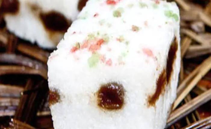 桂林的松糕以糯米粉和粳米粉掺杂揉制,融合一些当地特色的豆类,蜜饯,果肉,