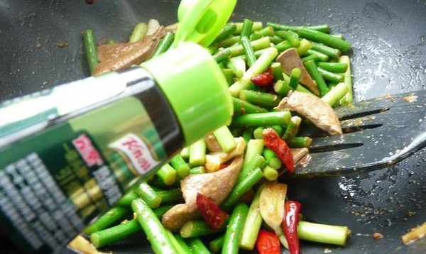 7:最后撒盐,鸡精和少许胡椒粉,加入半勺蚝油,快速炒出蒜香,猪肝翻炒至变色,切记猪肝不要炒太老。