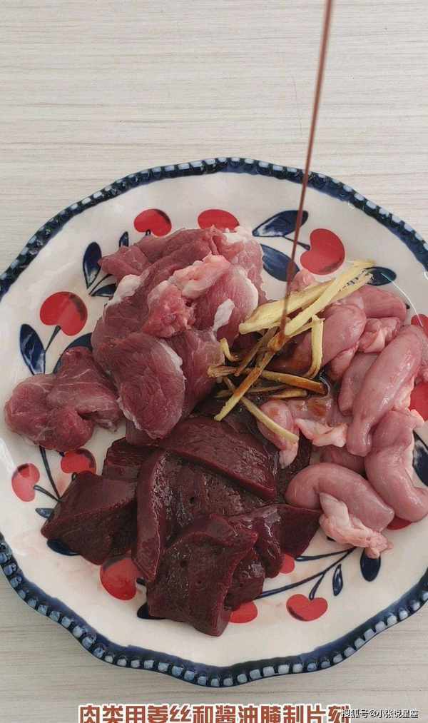 材料选择:准备新鲜的枸杞叶(实际上是枸杞芽,是春季长出的嫩叶。枸杞子的叶子一般在农村都有分布,但是在城市里很难弄到,叶子应该很新鲜和青),准备新鲜口蘑100克,准备猪肝150克(猪肝颜色要均匀,不能发灰,按压有弹性,猪肝一定要吃,否则会影响口感汤)并准备好。猪肉100克(选新鲜的前腿肉),准备姜约15克,盐少许,食用油少许,酱油少许,胡椒粉,水,淀粉一小勺,生抽半勺和其他香料。