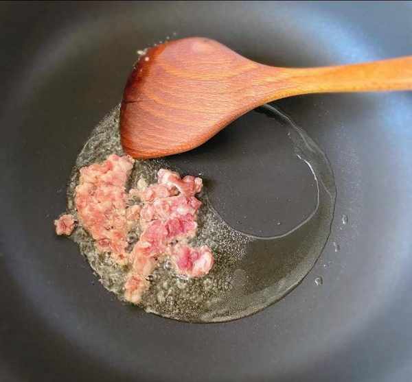 4:锅内倒入植物油,烧热,放入肉糜翻炒,待肉糜全部熟透变白后,加入少许老抽和料酒。