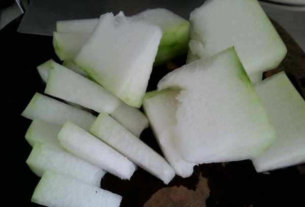 3:冬瓜对半切开,冬瓜去皮,冬瓜切小块,生姜一小块切片,葱切小块,准备腌制好的肉末。和冬瓜块,开始用肉末和毛豆煮这个油炸冬瓜。