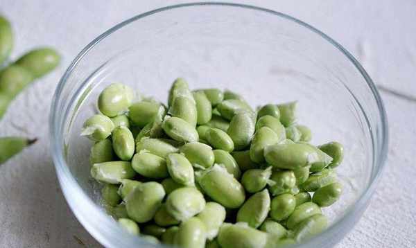 2:将青毛豆全部去皮(去皮后只有80克),用手捏住毛豆,洗净沥干水,再换一锅烧开热水,迅速将青毛豆下锅,捞出毛豆并添加它。在冷水中取出并放在一边。