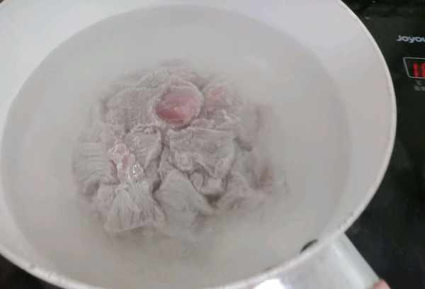 第三步:炖锅烧开一大锅水,烧开后加入瘦肉块焯水,加入一勺半料酒,姜几片放入锅中焯一下捞出备用以后使用。