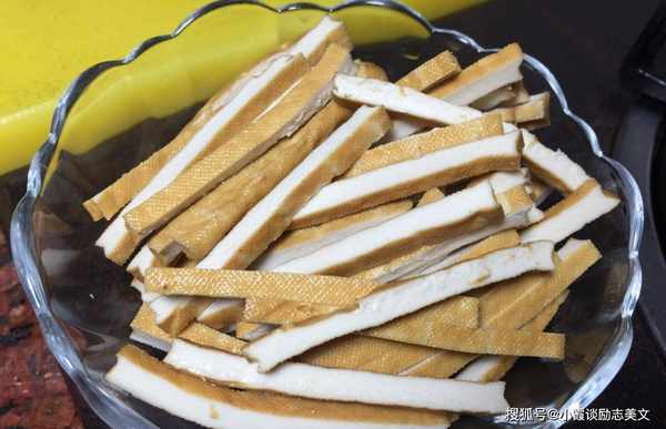 2:干香80克用冷水泡发,干香全部切成长条,用热水烫一下,可以去除干香的豆腥味,口感更佳。
