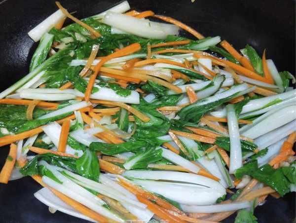 第六步:加入胡萝卜丝翻炒至软,与白菜叶一起食用,加入盐搅拌调味,加入鸡高汤和胡椒粉。
