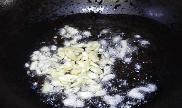 第五步:起锅烧热锅底,加入更多色拉油,加入蒜末快速炒香,加入白菜蒂炒软。