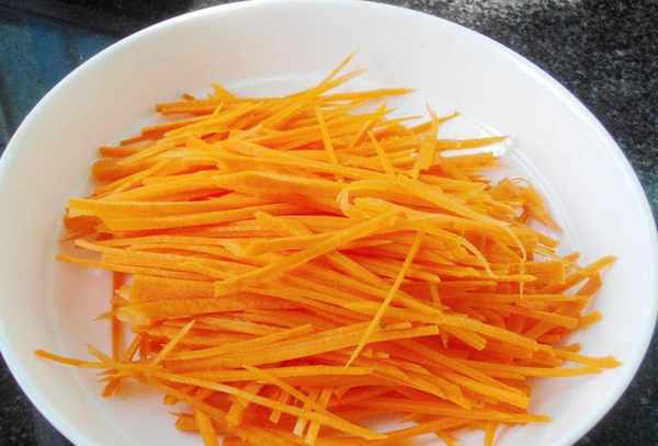 第二步:将胡萝卜清洗干净,先将胡萝卜切片,再切成几根细丝,用水泡一会,以免胡萝卜氧化,营养价值流失。