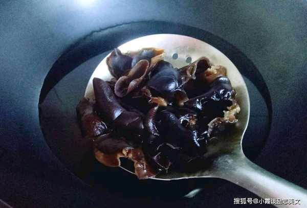 烹饪步骤2:先把干香菇泡在温水里,泡好香菇,把香菇的根切掉,然后把香菇焯水,撒上一勺盐,让香菇的味道特别安全,切香菇块成为碎片。
