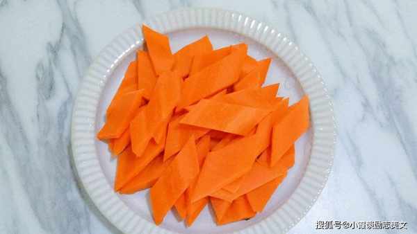 烹饪步骤1:买来的胡萝卜去皮,然后切成菱形片,锅里倒入少许水,撒盐搅拌,把切好的胡萝卜放入锅中,煮约5分钟。2分钟,然后迅速将其取出。