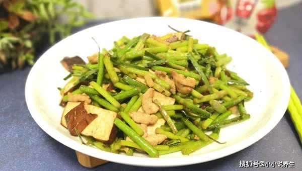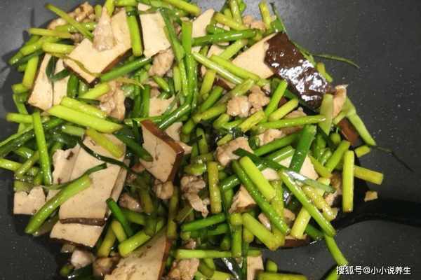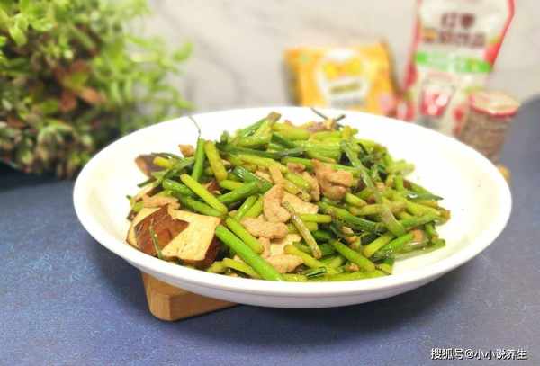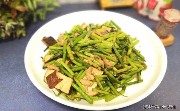 烹饪技巧:需要买新鲜的蒜苔、瘦肉和豆腐干。干豆腐用冷水浸泡并焯水。