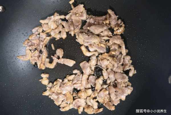 第四步:锅底加入更多的花生油,将油加热至60%的热度,将腌制好的手撕肉放入锅中,开大火翻炒至手撕肉变白。