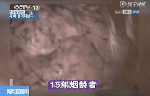 韓國KBS電視臺公開了一段肺部內窺鏡記錄下的影像片段,下圖是烟齡15年的肺。