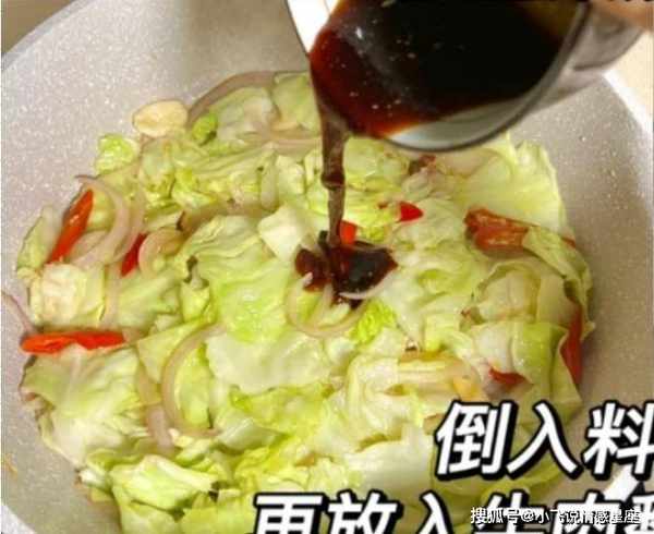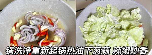 第七步:锅底留少许油,放入切碎的大蒜和辣椒小米,加入切碎的洋葱,炒至洋葱爆香,加入卷心菜边炒边炒至断。