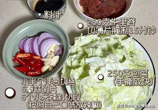 配料详情:买250克嫩牛里脊(牛肉是很有营养的肉,挤的时候肉应该很轻,呈粉红色,有弹性,可以在上面煎牛肉片),买半个白菜(推荐这个选择紧实的白菜一些,这样味道很甜,适合炒),选择一些辣小米,选择半个紫洋葱,几瓣大蒜,一些植物油,几片姜,少许料酒、生抽三勺、蚝油一勺、糖和盐少许、胡椒粉少许、料酒一勺、生粉一勺、蚝油一勺、水少许、香油少许、其他香料。