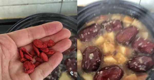 食材选购:挑选一个水分足的红苹果,选购一小把花生(优先选择红皮花生),选购100克,红枣几个,红糖两块,冰糖少许,清水1000毫升左右,优质宁夏枸杞子25个,香油两滴,其他。