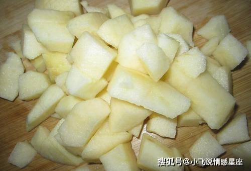 制作步骤1:用工具把红苹果去皮(就算现在苹果都是套袋的,但是很多无良商家打蜡,太多会影响身体健康),需要把苹果切开,然后挖取出苹果的核,全部切成小块。