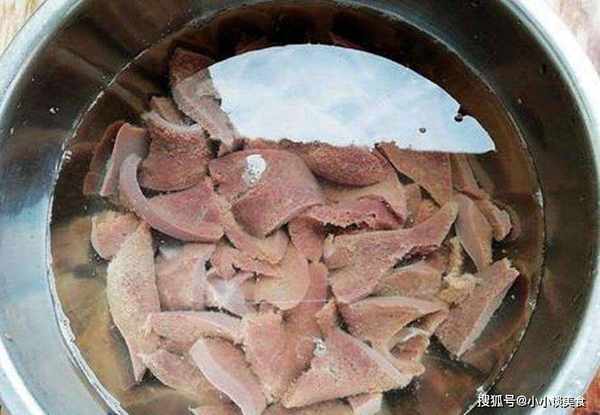 2:猪肝一大块放在碗里,用清水泡10分钟左右,挤掉表面的血水,猪肝切成几块,一定要逆纹切,用干净的水冲洗干净水两次。