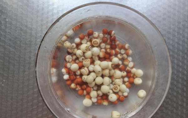 第三步:将新鲜莲子洗净。用食用碱给莲子加水。注意1:5的比例。将莲子放置约6小时。准备好以上材料,开始做这道芡实莲子薏米汤。