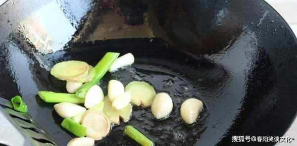 第七步:将大蒜全部拍碎,加入色拉油预热锅,放入姜蒜爆香,将猪肝片全部倒入锅中,大火翻炒一分钟。