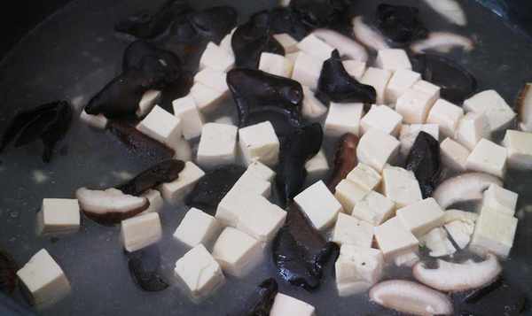 步骤5:然后加入切碎的香菇和黑蘑菇,大火煮3-5分钟,加入豆腐块转小火煮。