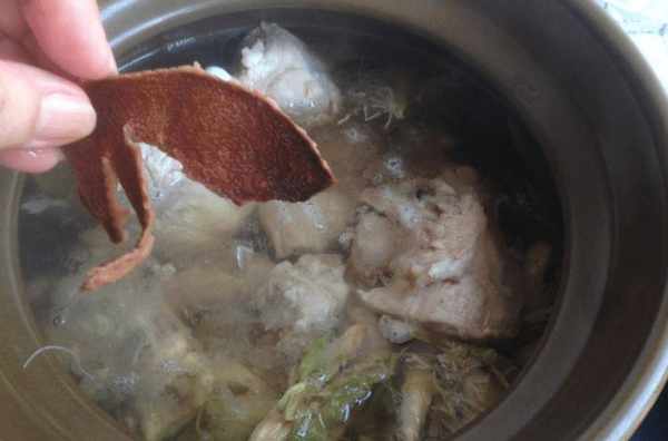 6:大火煮一个小时,中间撒上少许陈皮(需要将陈皮泡软,刮去里面的白色果肉)。