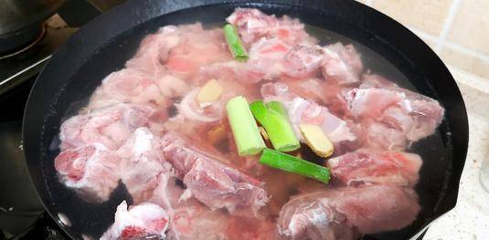 3:猪骨用冷水冲洗干净,姜去皮切块,葱洗净切段待用,准备好猪骨和泡好的霸王花,开始炖这道猪骨汤。