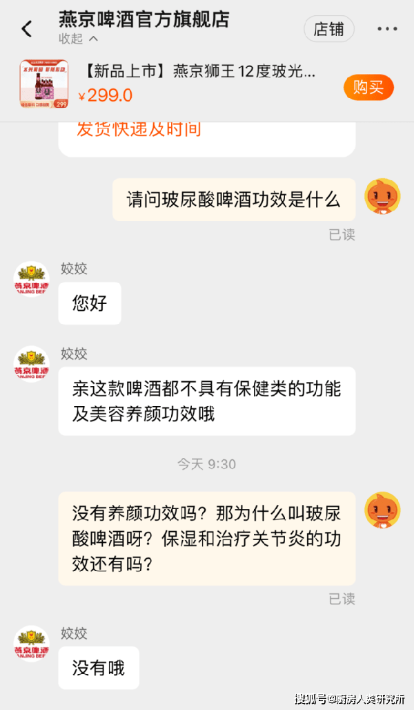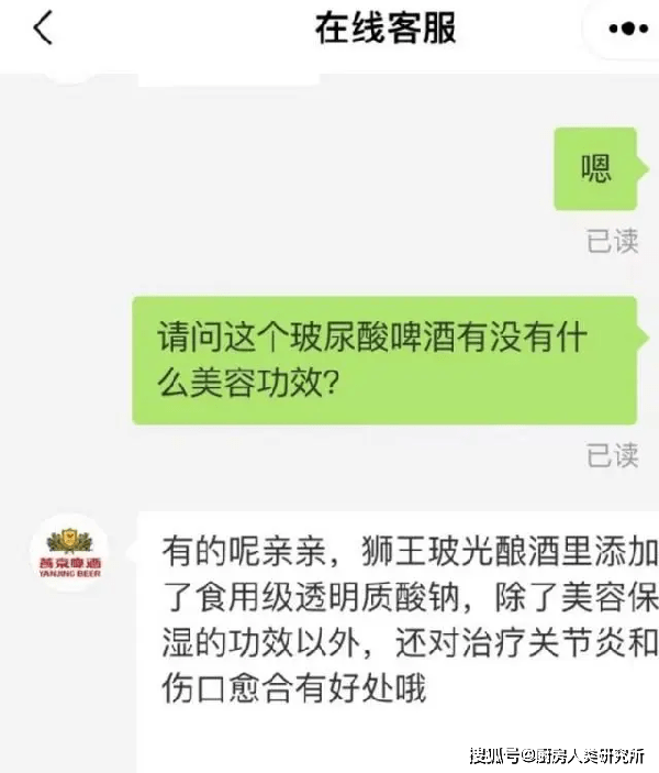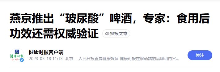 3月9日,燕京啤酒客服曾表示,该款“玻尿酸”啤酒除了美容保湿的功效以外,还对治疗关节炎和伤口愈合有好处。
