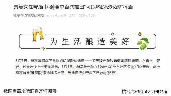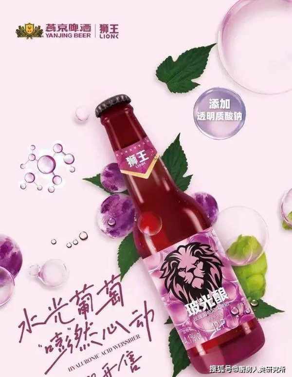 前几天,燕京啤酒官方微信公众号发文,表示将推出首款透明质酸钠啤酒:狮王玻光酿玫瑰葡萄精酿啤酒。