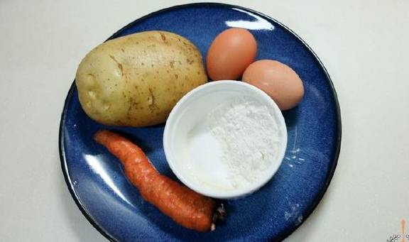 材料:土豆1个、胡萝卜1根、鸡蛋2个、面粉少许、盐、酱油