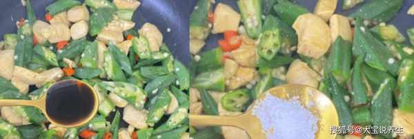 第五步:倒入秋葵,快速煎一分钟。一边搅拌一边煎至熟透。加入两勺生抽、一勺蚝油、少许糖和盐,用锅铲快速翻炒。
