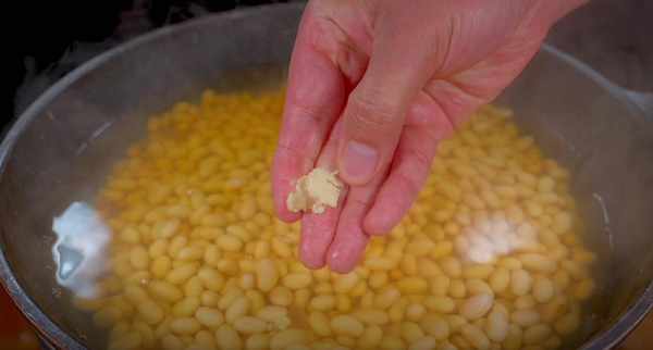 2、把控好水分的黄豆放进锅中,再加入多点的清水,盖上锅盖开大火煮,水开了以后,转成中火慢慢煮,煮一个小时左右的时间,把黄豆煮至轻轻一捻,就能够碾碎即可,然后把黄豆捞出过凉。