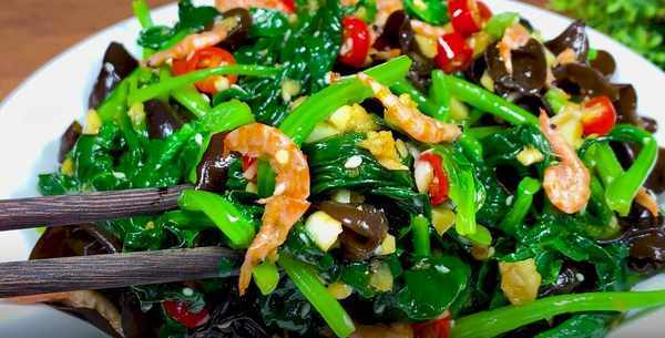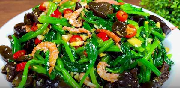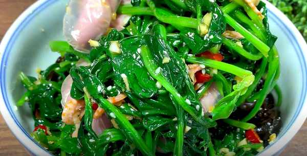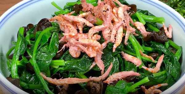 主要食材:菠菜、木耳、大虾米、大蒜、小米辣