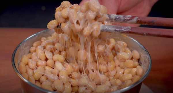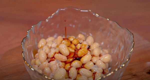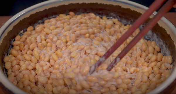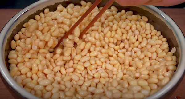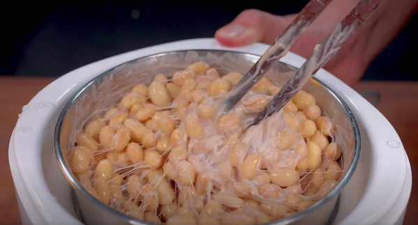 7、发酵好的黄豆搅拌好以后,提起来有细细长长的拉丝,而且闻着也是特别的香,吃起来还有营养,而且这个豆子的吃法多种多样,今天给大家推荐一道用这个豆子做的凉拌菜。