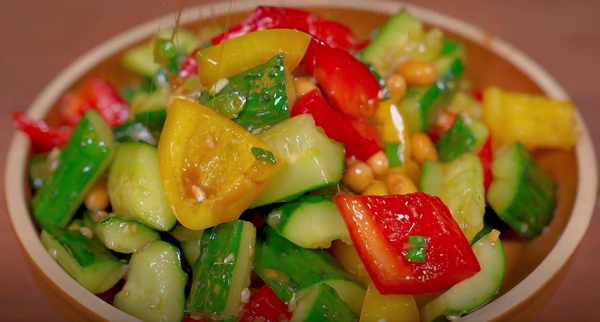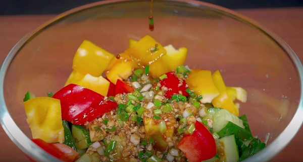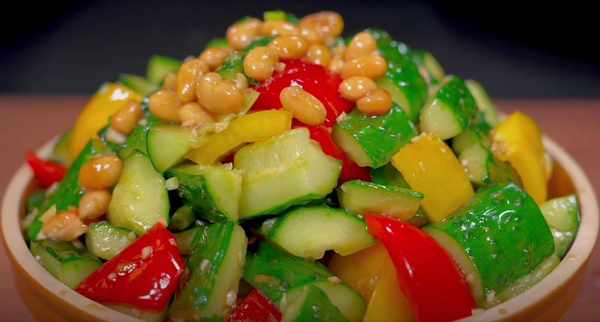 10、把切好的配菜、调好的料汁都倒进碗里,再放入搅拌好的豆子,用手充分抓匀后,就可以开吃了,这样做的凉拌黄瓜,别有一番风味,闻着就特别的香。