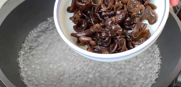 3、再准备一点提前泡发好的木耳,清洗干净后控水捞出来,锅中提前烧开水,把木耳放入锅中焯烫一下,开大火烫一分钟。