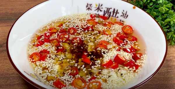 6、在装有大蒜、小米辣的小碗中,再加入一勺白芝麻,淋入烧好的热油,给它激发出香味,然后加入一勺食盐,一勺白糖,一勺生抽,一勺香醋,一勺香油,用勺子充分地搅拌均匀,这样一个好吃的料汁就调好了。