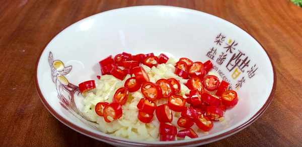 2、再准备多一点的大蒜,拍扁,然后剁成蒜末,大蒜可以多准备一点,这样蒜香味浓郁,会更好吃,再来几根洗干净的小米椒,给它切成圈,切好后和大蒜装一起备用。