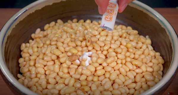4、等黄豆全部放凉了以后,再次放进大盆的里面,再准备一小袋菌粉,也就是纳豆菌,老一辈的做法,是把黄豆铺在稻草的上面去发酵,但现在稻草不好找,所以用这个菌粉来发酵同样是可以的。