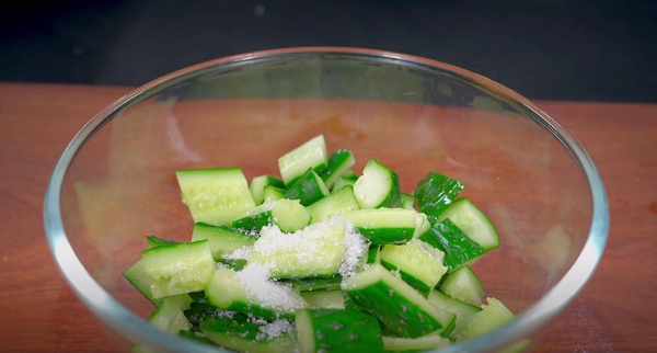 8、在做凉拌菜的时候,可以放入一些切好的黄瓜,加入两勺白糖,先用白糖把黄瓜腌制十分钟,也可以根据自己的口味,切一点适量的配菜放到黄瓜里面,一起去拌着吃。