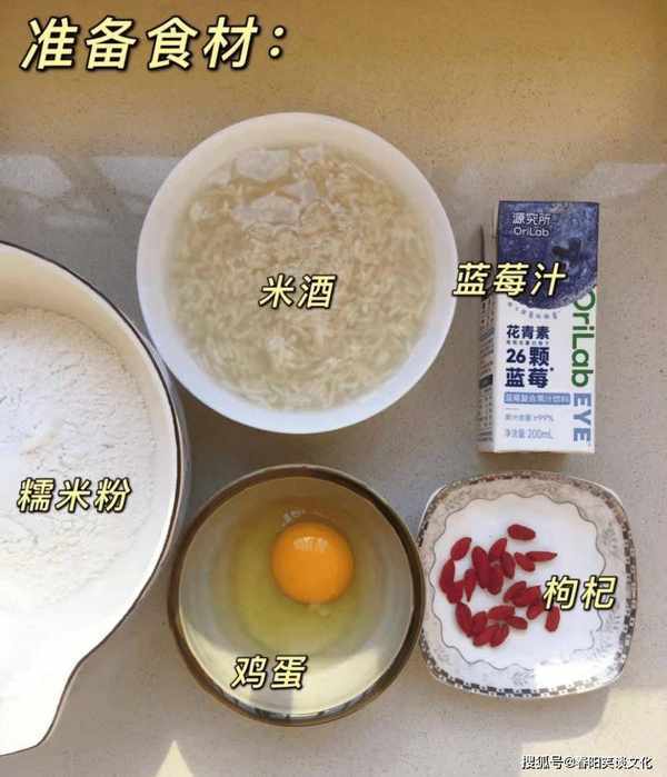 配料明细:蓝莓汁一盒,糯米粉约350克,红羽扇豆适量(红羽扇豆颗粒清晰,表面没有浮灰和污垢,颜色很粉,很干),一个鸡蛋几个(鸡蛋的好坏要看是否有松散的蛋黄,如果蛋壳没有破损,新鲜鸡蛋蛋黄清白,蛋壳很厚,蛋壳没有破损),100毫升酒酿,几个水碗、适量温水、少许白糖、一小把冰糖等。
