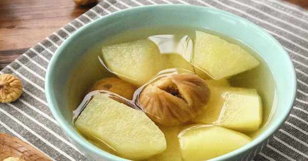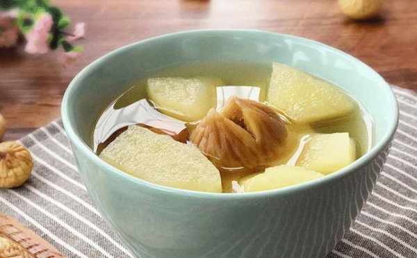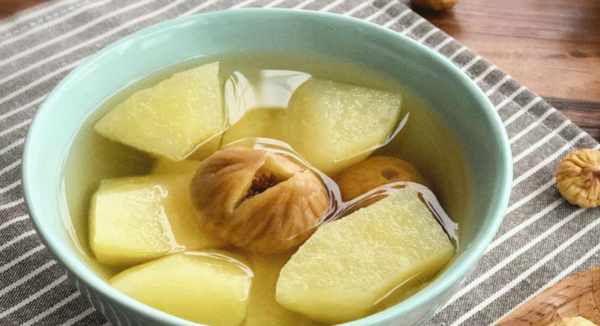 好处:苹果是一种富含维生素和水分的水果。水煮苹果的营养价值更高。用无花果烹调可以补充维生素和水分,有效消除斑点和皱纹,加快新陈代谢,保持皮肤健康。由于无花果中含有入肺经的微量元素,可防治咽喉炎,有的可抗感冒、止咳。特别是孩子们可以多喝这种水果汤,增强抵抗力,补充各种营养素。早吃早受益。